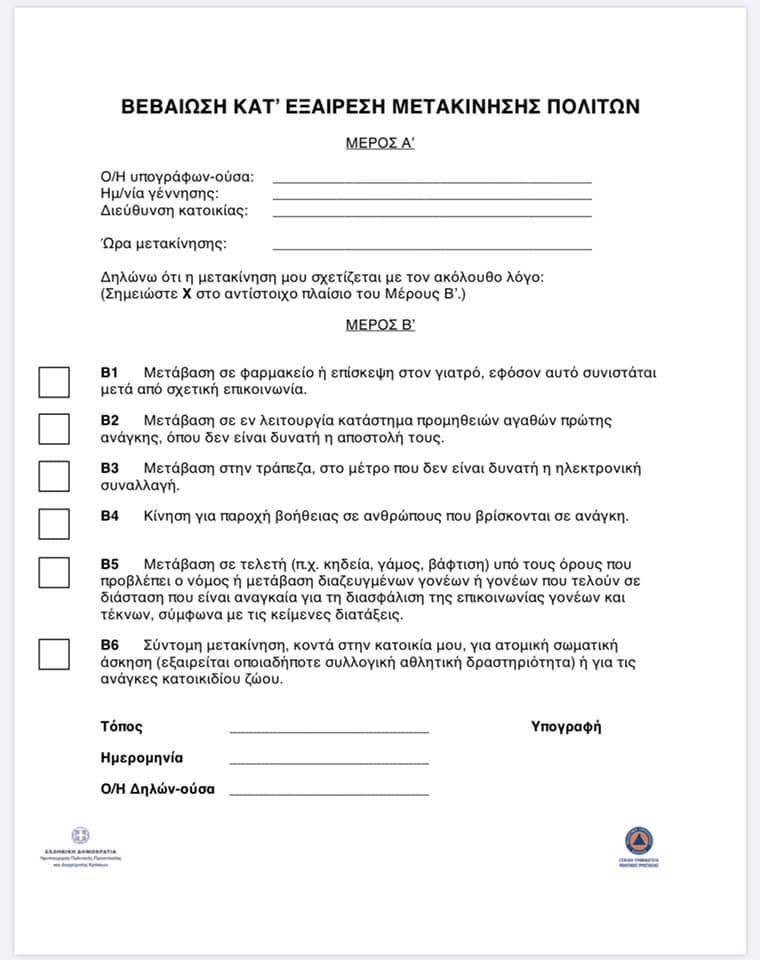 - έντυπο τύπου Β Δήλωση μετακίνησης που θα αναγράφεται το ονοματεπώνυμο, η διεύθυνση κατοικία, ο λόγος που σχετίζεται με την μετακίνηση, ο τόπος προορισμού π.χ. φαρμακείο, σούπερ μάρκετ, πρατήριο καυσίμων, ιατρείο κ.λπ.
